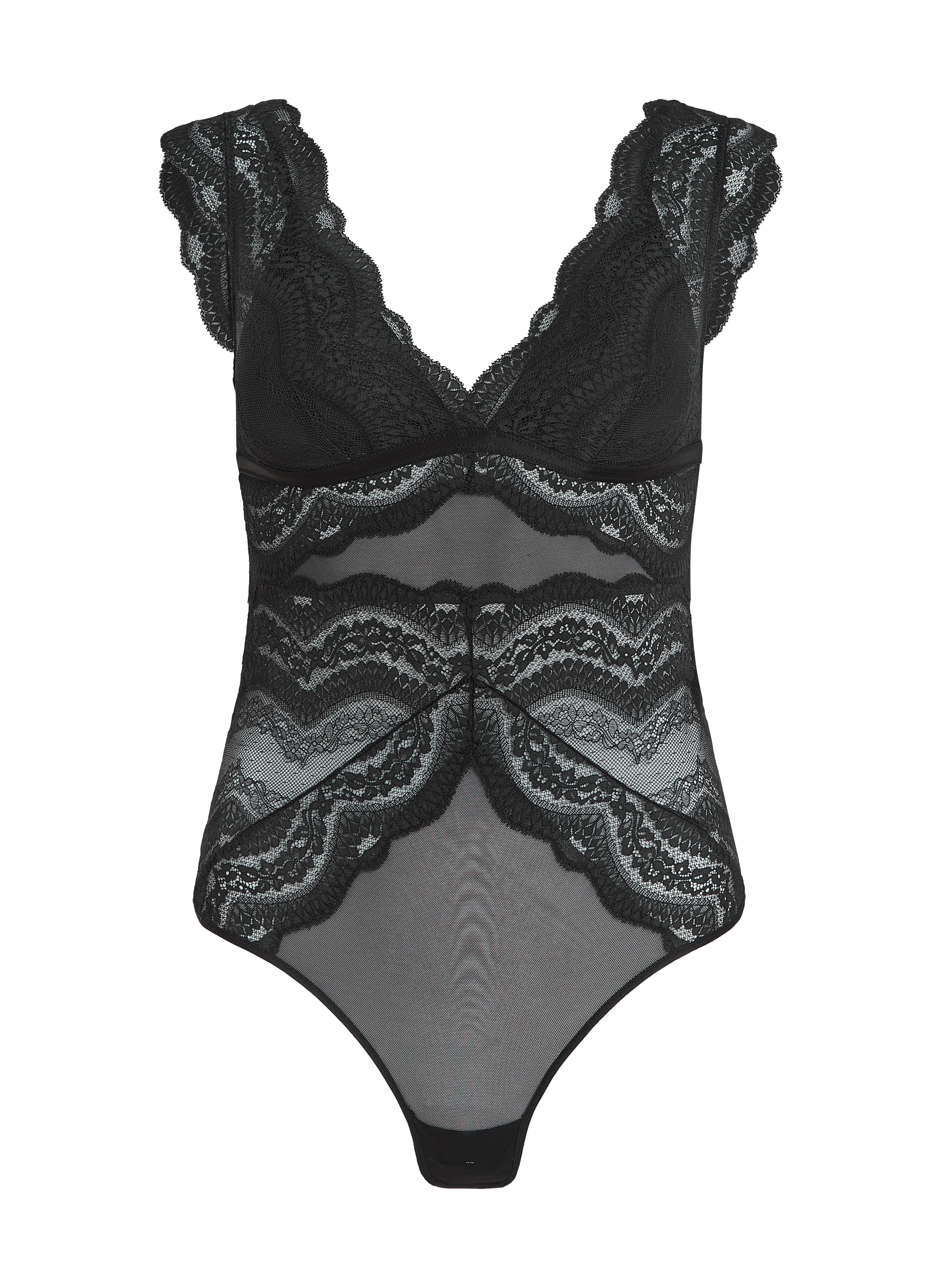 Ziehen Sie alle Blicke auf sich mit diesem wunderschönen Body, einem atemberaubenden Stück, das Eleganz ausstrahlt. Die Vorderseite zeigt zarte Spitzendetails, während das Mesh auf der Rückseite eine elegante und schmeichelhafte Passform bietet. Der Cut-out-Detail auf der Rückseite verleiht eine gewagte Note und macht diesen Body perfekt.