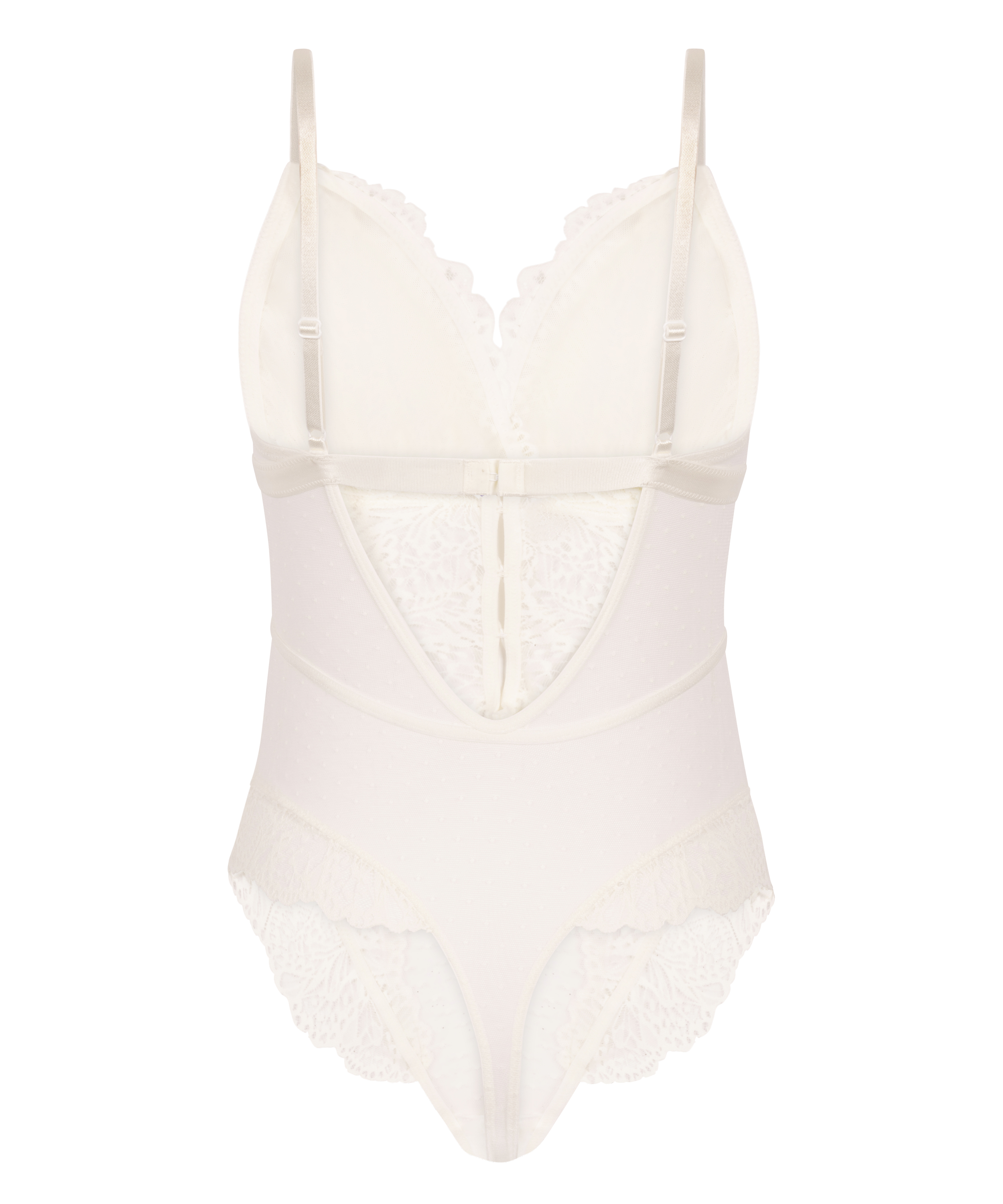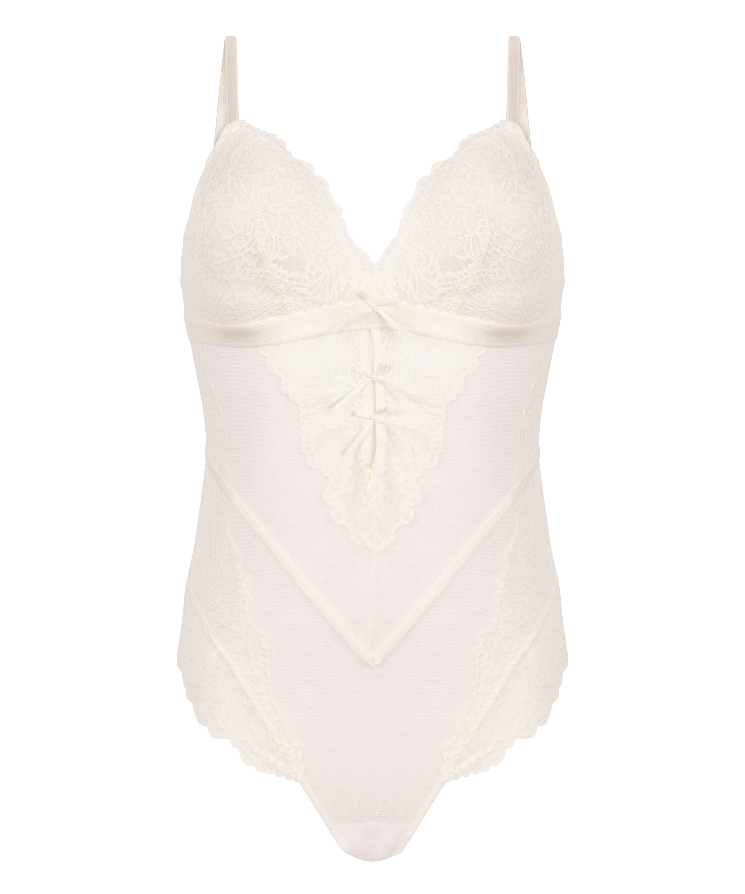 Bezaubernder Body aus Mesh-Gewebe mit Spitzenverzierungen am Ausschnitt und an den Seiten. Zierschleifen sorgen für einen verspielten Touch.