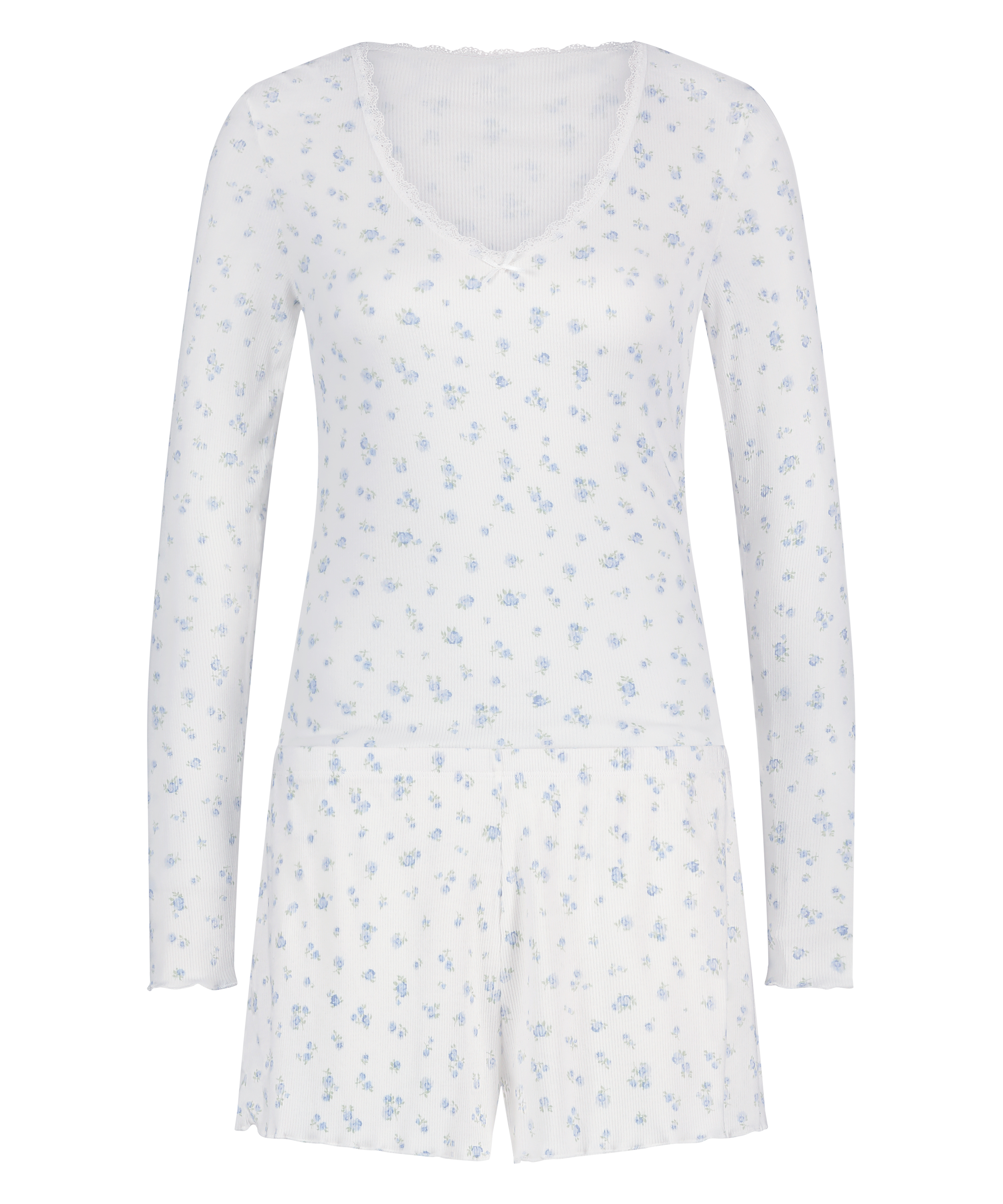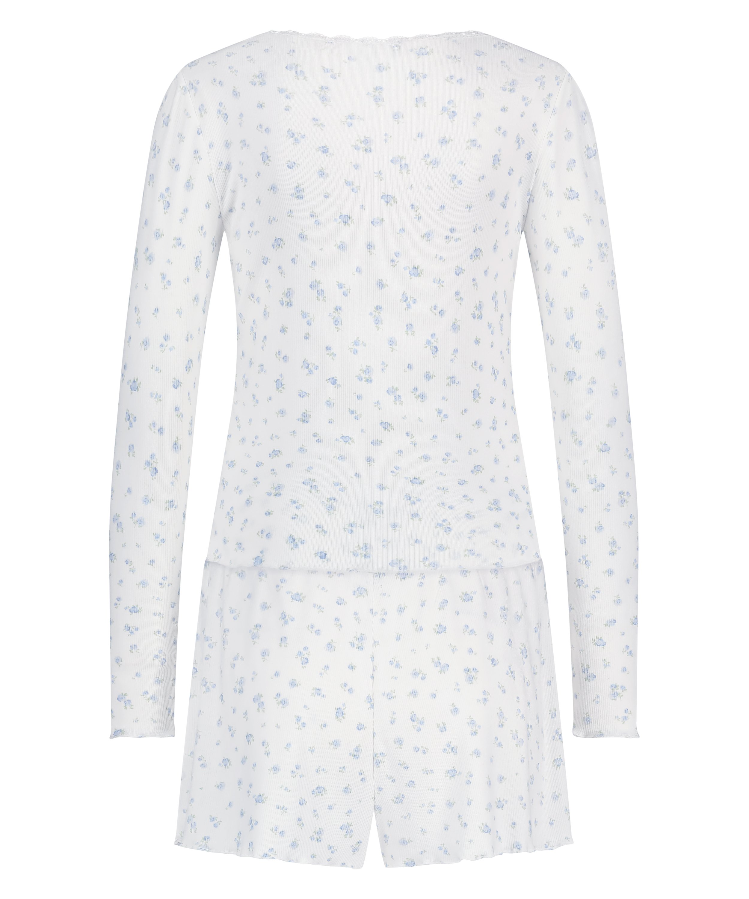 Mache es dir mit unserem Pyjamaset gemütlich, einer perfekten Kombination aus Komfort und Charme. Dieses zweiteilige Set besteht aus einem weichen, gerippten, langärmeligen Oberteil und passenden Shorts. Das Oberteil verfügt über Spitzendetails am Ausschnitt, die einem gemütlichen Design eine feminine Note verleihen. Dieses Pyjama-Set ist ideal zum Faulenzen oder Schlafen.