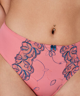 Dieser Slip ist aus einem geschmeidig fallenden Material, das für eine angenehme Passform sorgt. Der Slip ist vorne mit Blumenstickerei und einer Schleife verziert.